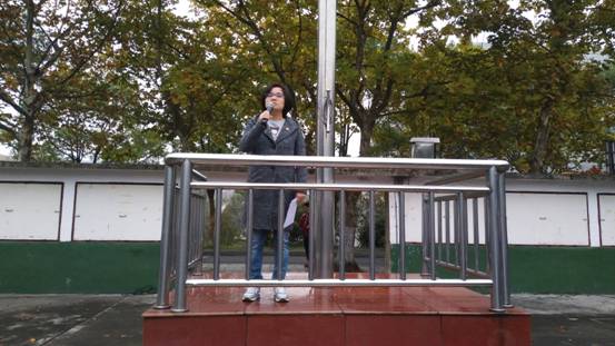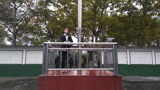 升旗结束后,由16级学生代表王晓庆作主题为“喜迎十九大,共创美好新时代”的国旗下讲话。她呼吁大学生关注时事政治,居安思危,为建设中国特色社会主义而发奋学习。