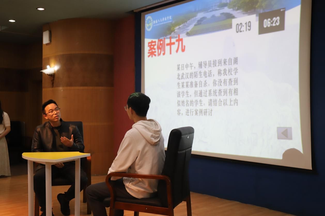 案例研讨以“我提问,你回答”的方式开展,由两位选手围绕案例共同辨析原因、研讨对策、总结规律。主要考察辅导员综合运用理论分析问题、研判问题、解决问题的能力。