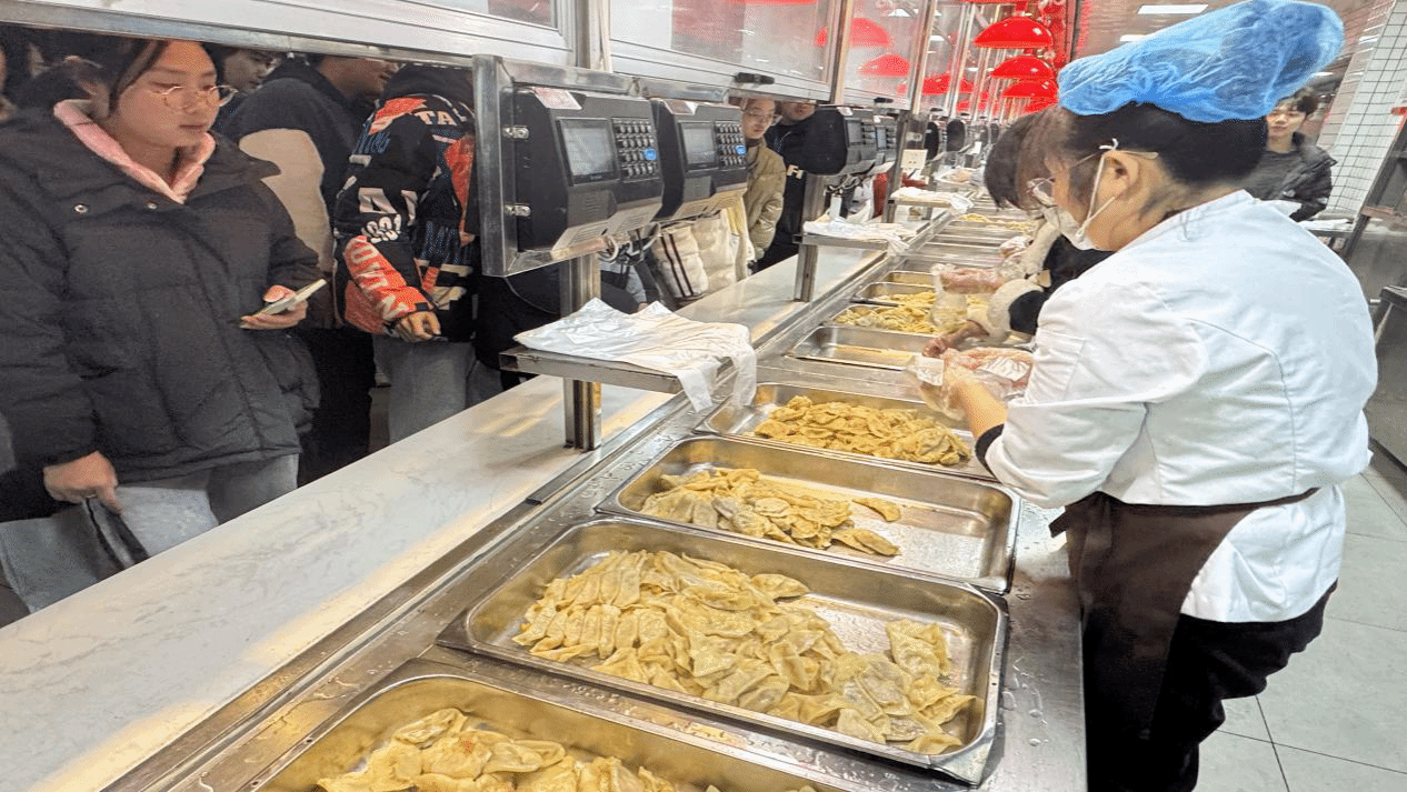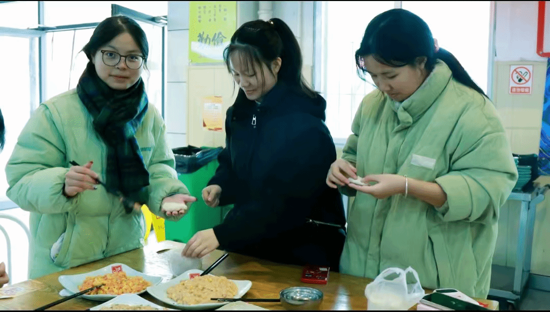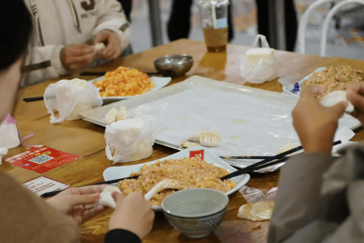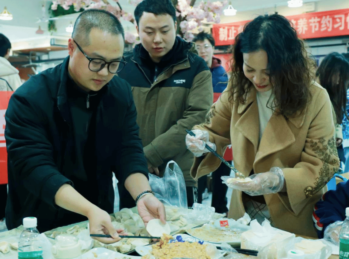 活动现场,工作人员有条不紊地分发饺子皮、饺子馅、零食水果以及各类包饺子的工具,为即将开始的活动做好准备。随后,同学们自由组队,拌馅、摊皮,彼此协作,装填馅料,精心捏合,个个大展身手,尽情展现自己独特的包饺子“绝技”。老师们亲临现场,与同学们默契配合,亲切交流互动,现场欢声笑语此起彼伏,热闹非凡。大家包出的饺子形态千差万别,却无一不饱含着对节日的深情厚谊与美好期许。不多时,一盘盘热气腾腾的饺子新鲜出炉,师生整齐有序地排队领取,品尝亲手包的饺子。