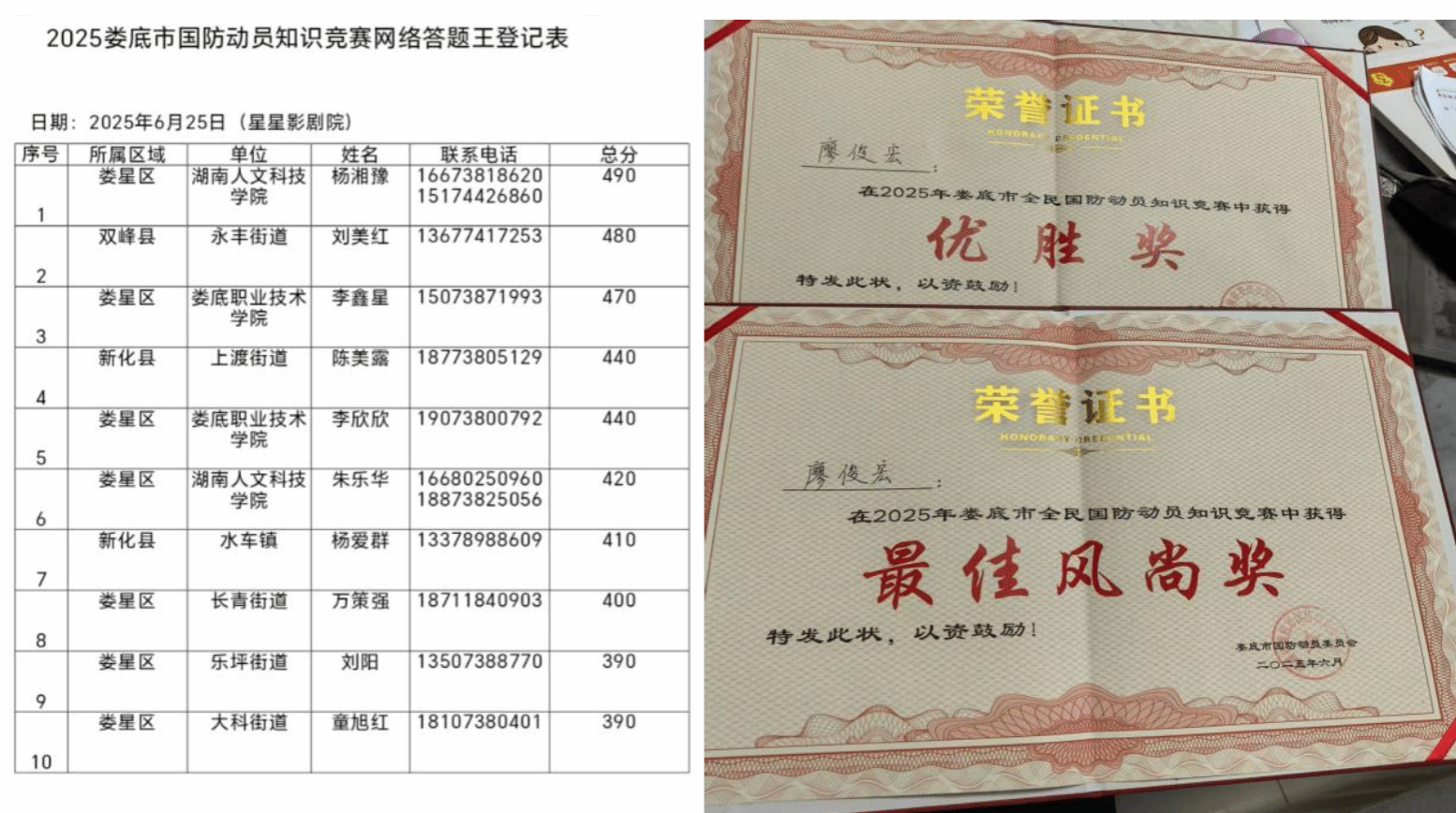 为深入贯彻落实全民国防教育要求,增强全民国防观念,普及国防动员知识,6月25日,由娄底军分区、市委宣传部、市发改委等单位联合主办的娄底市全民国防动员知识竞赛总决赛圆满落幕。KY官网师生在比赛中表现优异,马克思主义学院朱乐华、杨湘豫两名同学荣获“答题王”称号,学生工作部综合科科长廖俊宏斩获个人优胜奖和最佳风尚奖。