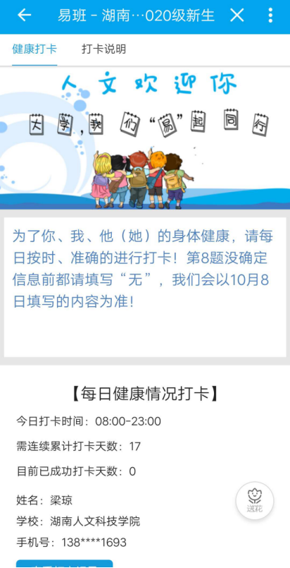 四、点击“打卡”,进入打卡界面,请仔细看清楚第一行的蓝色文字说明;