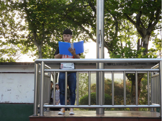学生代表体育学院贾晨飞上台进行发言,他通过对历史以及当今局势状况的独到分析,向大家诠示了"铭记光辉历史,聚力强国强军”的深刻内涵,号召有志儿女们积极地投身到祖国伟大的国防事业中去,为祖国的繁荣昌盛保驾护航。