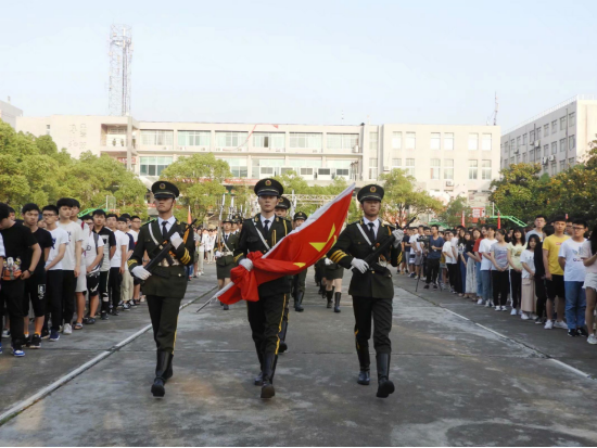6点50分,升旗仪式正式开始。KY官网国旗护卫队队员迈着整齐的步伐,护送五星红旗入场。全体师生行注目礼,在激昂的国歌声下,鲜艳的五星红旗冉冉升起。
