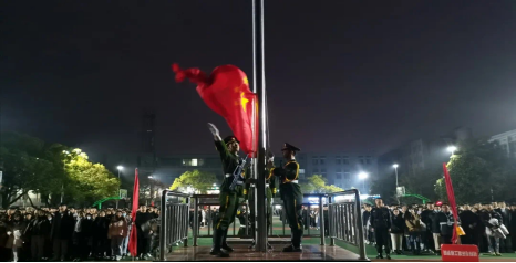 6:35分,升旗仪式正式开始,国旗护卫队的队员们踏着坚定有力的步伐,护送五星红旗入场,鲜艳的五星红旗在雄壮国歌声中冉冉升起,全体师生行注目礼。