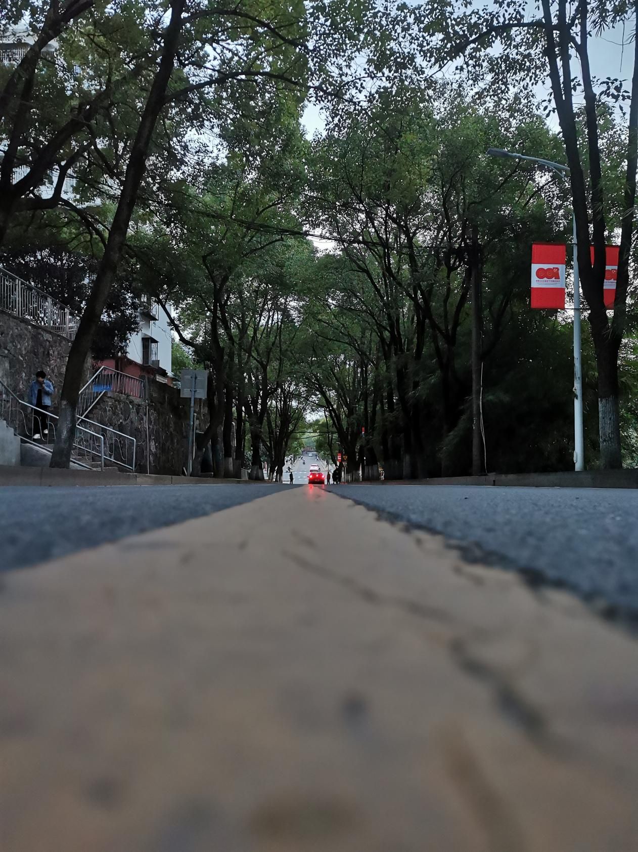 2021年的取景框里,林荫大道还挂着五四运动胜利一百周年的路灯宣传牌,大道旁边是四科苑那承载着数年的古旧高墙。我按下快门时,已是傍晚黄昏,那时空气中弥漫的是诱人的饭菜香气,看前方的路,是一路平坦。