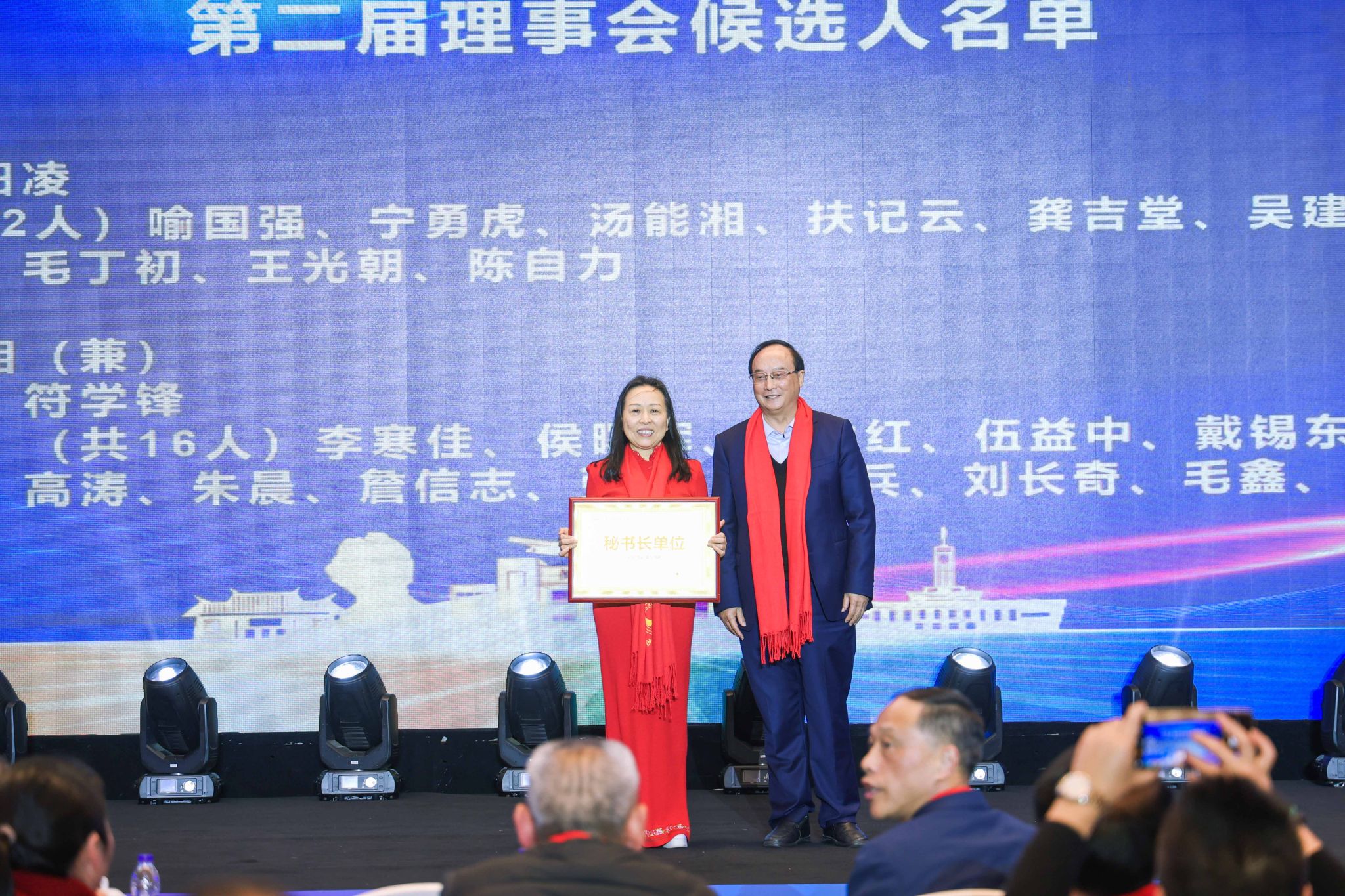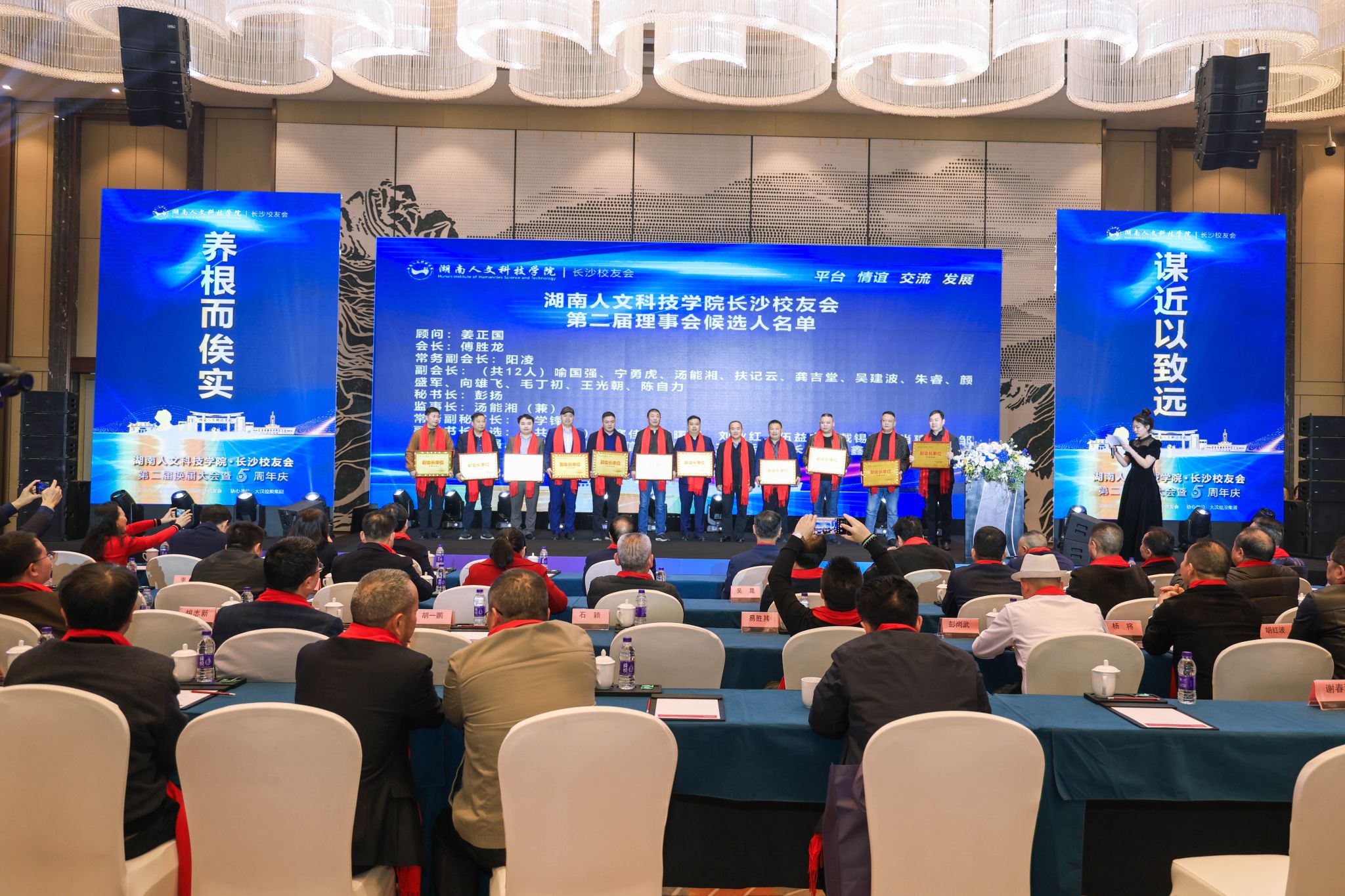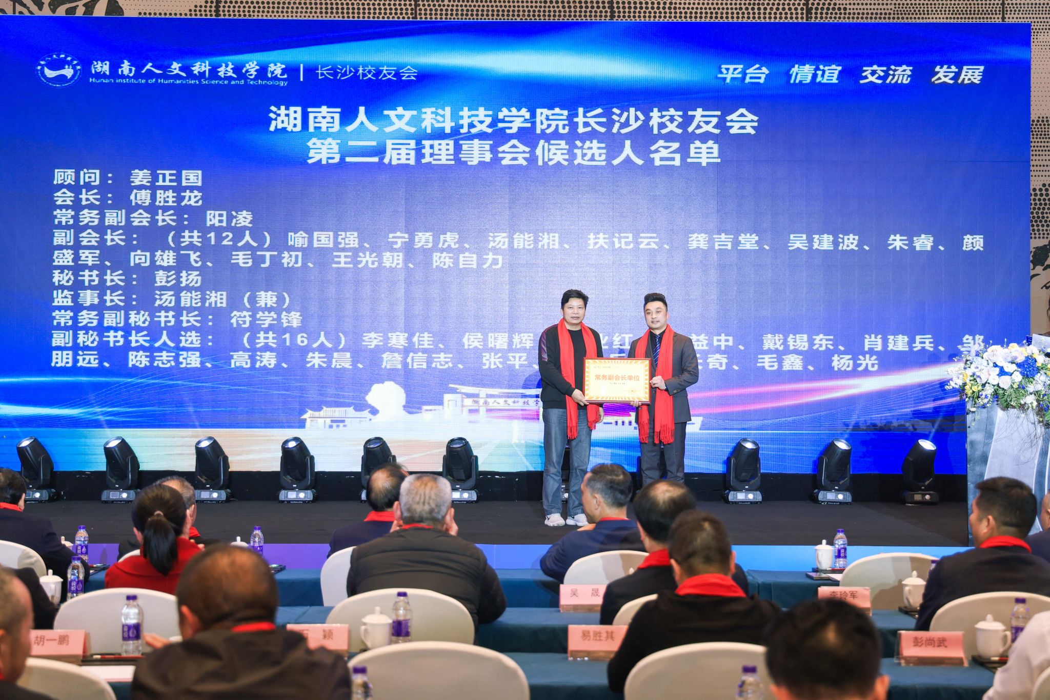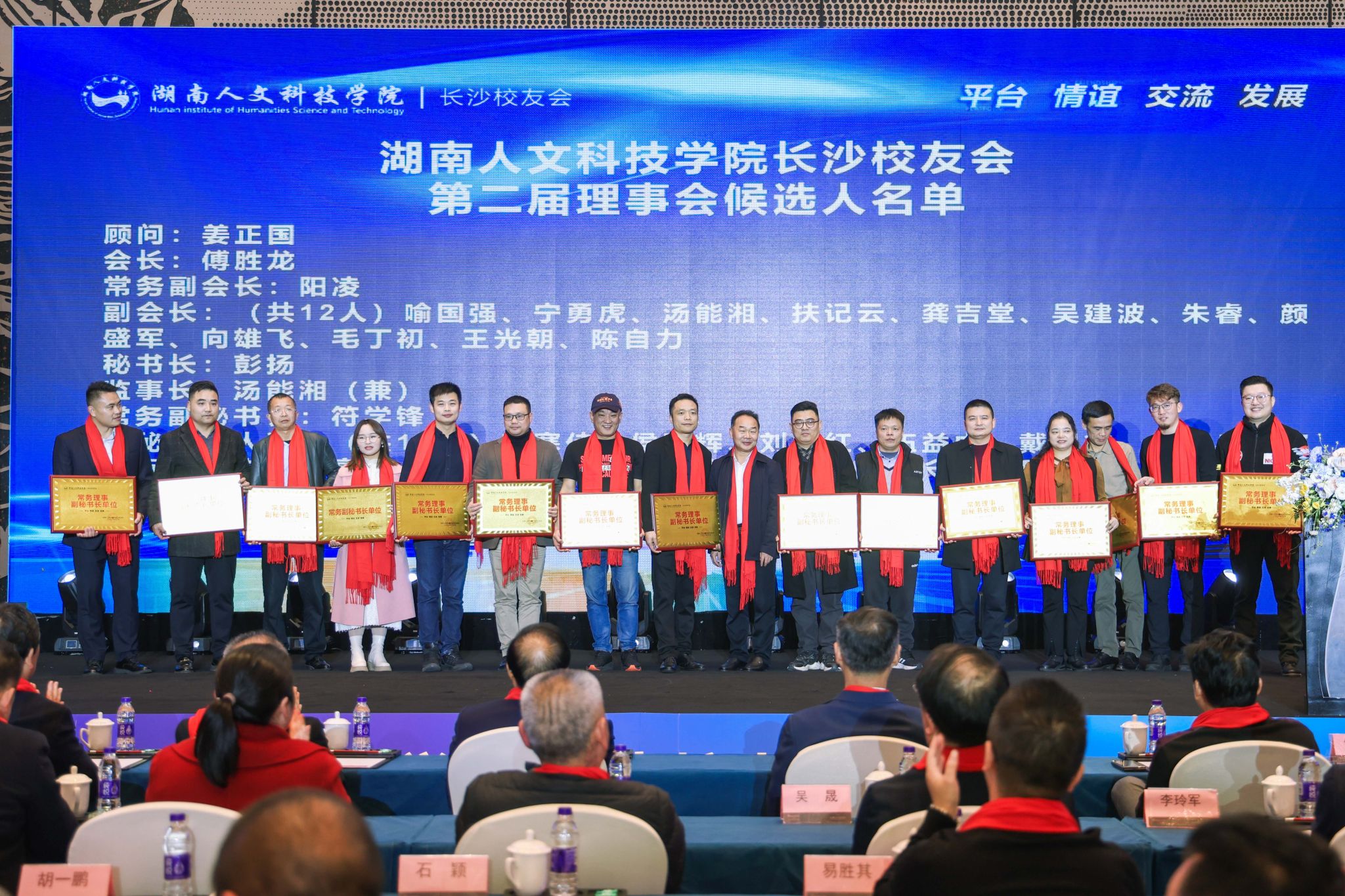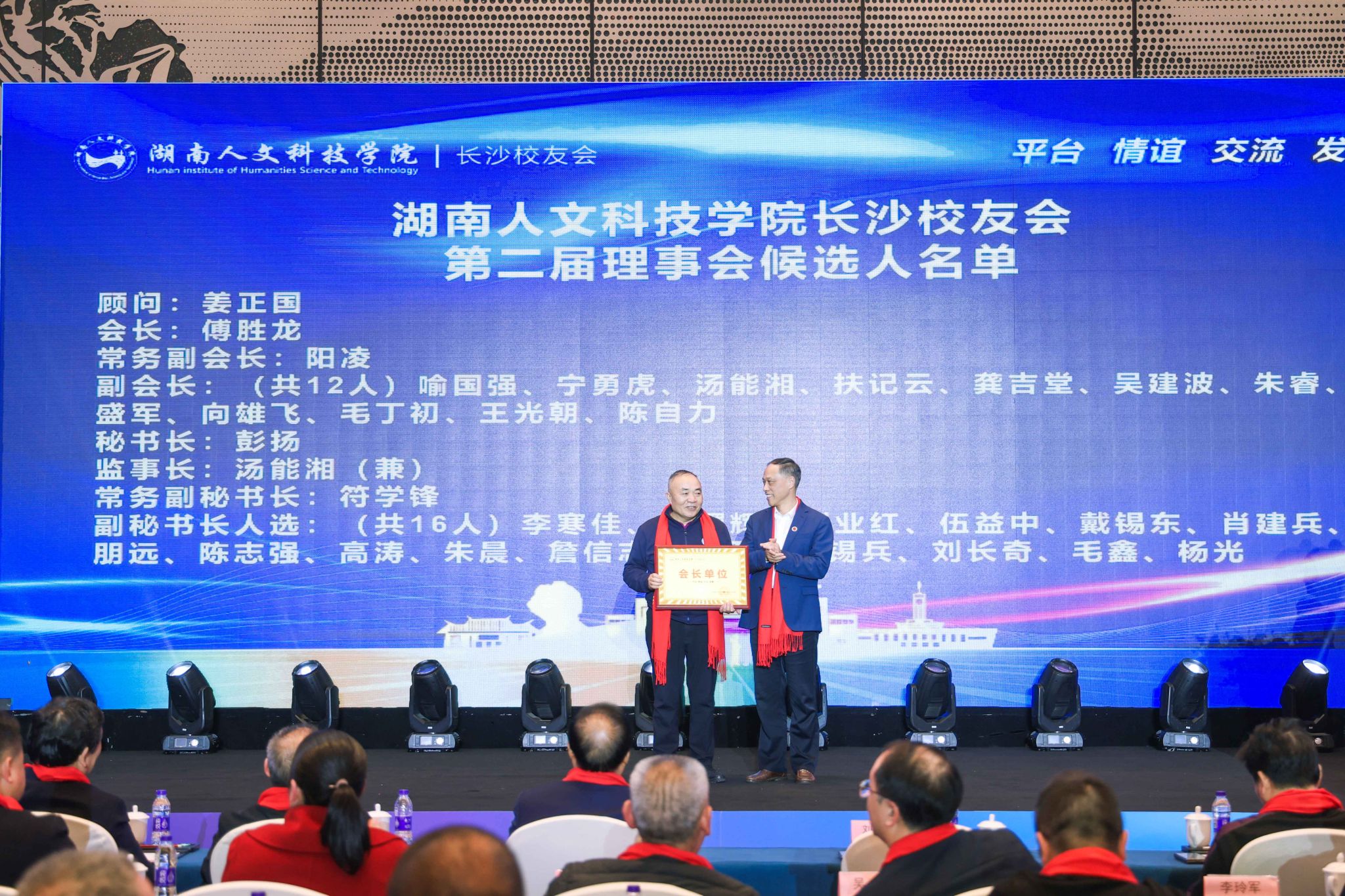 会上,参会代表选举产生了新的常务理事会成员。姜正国当选为顾问,傅胜龙当选为会长,阳凌当选为常务副会长,喻国强、宁勇虎、汤能湘、扶记云、龚吉堂、吴建波、朱睿、颜盛军、向雄飞、毛丁初、王光朝、陈自力当选为副会长,彭扬当选为秘书长,汤能湘当选为监事长,符学锋当选为常务副秘书长,李寒佳、侯曙辉、刘业红、伍益中、戴锡东、肖建兵、邹朋远、陈志强、高涛、朱晨、詹信志、张平、王锡兵、刘长奇、毛鑫、杨光当选为副秘书长。姜正国、刘铁铭、刘和云、刘铁峰、朱强等为常务理事会成员颁发了聘书。