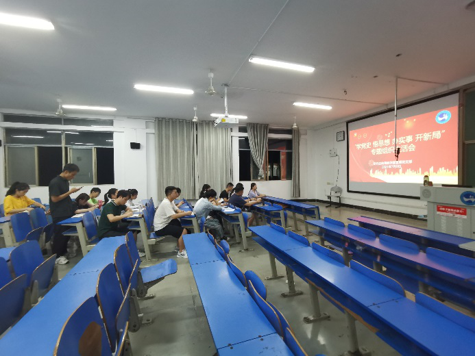 2021年7月9日19:00我支部在致远楼210成功举办“学党史、悟思想、办实事、开新局”专题组织生活会,支部书记彭健民、支部副书记向瑞桃以及组织委员王文琴莅临会议现场。此次会议根据上级有关疫情防控的要求,在校党员集中在教室召开会议,因疫情防控无法返校的党员通过学习强国APP连线参加线上会议。