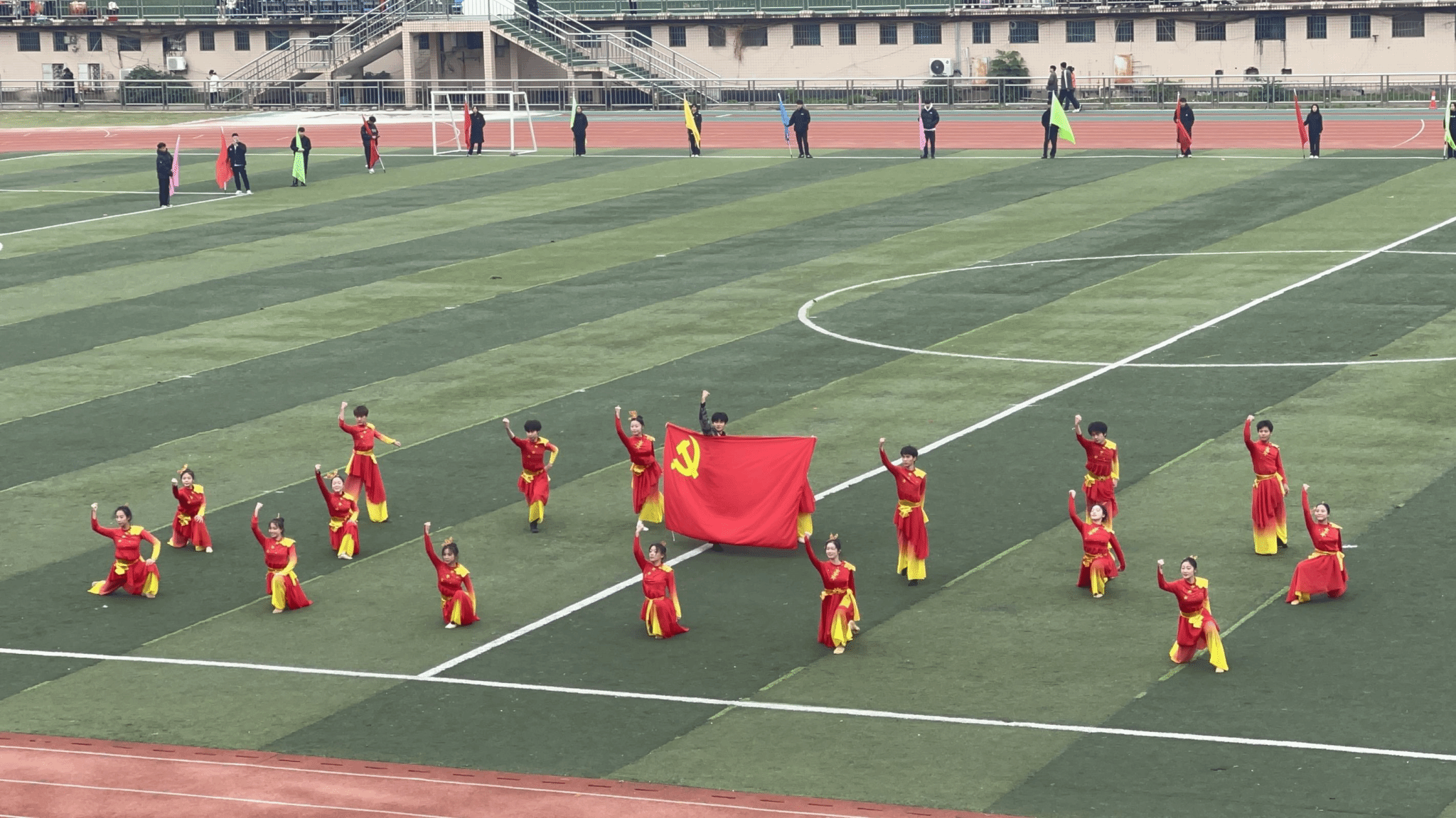 开幕式伊始,激昂的运动员进行曲奏响,国旗护卫队迈着整齐有力的步伐率先入场。他们身姿挺拔,步伐坚定,当激昂的国歌奏响,全场肃立,国旗在众人的注视下缓缓升起。这一刻,运动场上的激情与爱国的热忱完美融合,激励着运动员们在赛场上拼搏奋进,为荣誉而战。随后上场的是裁判员方阵,他们身着统一制服,神情庄重,步伐坚定,传递出对规则的尊重和维护赛场秩序的决心,做运动会顺利进行的护航者。