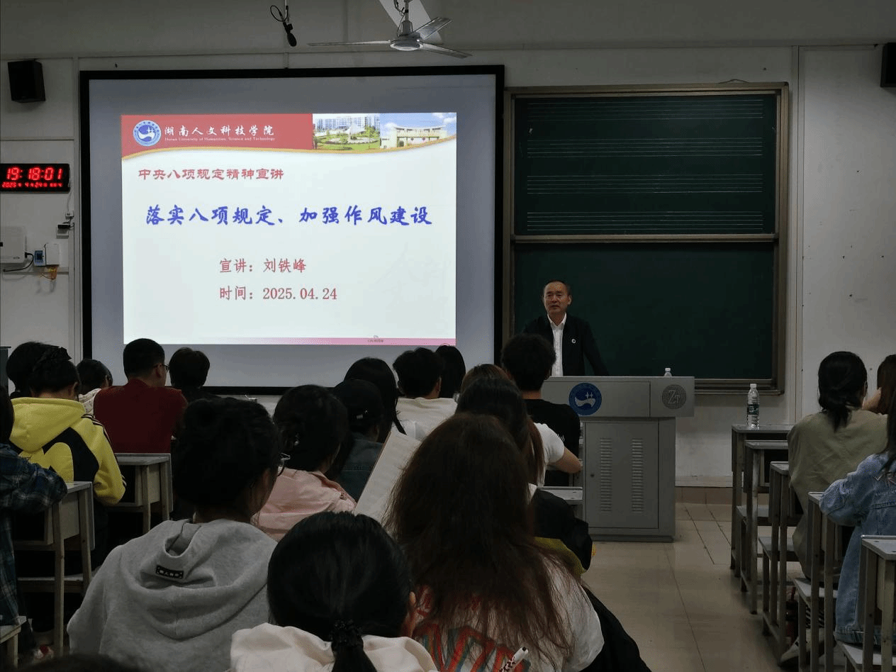 为深入贯彻中央八项规定精神学习教育,筑牢入党积极分子思想根基,推动作风建设走深走实。2025年4月24日,校党委委员、副校长刘铁峰为音乐舞蹈学院第37期入党积极分子授课,授课主题为“落实八项规定 加强作风建设”。