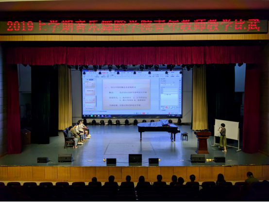 2019年4月9下午两点半,为配合学校本年度青年教师教学比武活动以及顺利通过学校审核评估,加强课堂教学管理,提高教师课堂教学水平与能力,音乐舞蹈学院在逸夫楼音乐厅举办了青年教师课堂教学比武。为组织好本次活动,音舞学院邀请学校督导组陈征南教授、杨竟成副教授、欧阳晨副教授、宫维民副教授和在院内随机抽选部分职称高、教学能力强和教学经验丰富的专任教师担任评委,音乐舞蹈学院领导班子和全体专任教师一起现场聆听和观摩整个教学比武全过程,本次教学比武由李旭开副院长担任大赛主持。