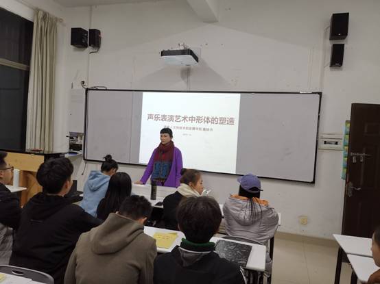 康晓丹副教授结合自身的理论研究与实践经验从“形体塑造的内涵”、“形体塑造的内容”、“形体塑造的原则”、“不同类型声乐作品形体塑造的方法”、“形体塑造中应注意的问题”五个大的方面进行了深入浅出的讲解。讲座中,结合学生们在声乐表演艺术中形体塑造存在的问题,康晓丹老师把学生请上讲台,从“站姿、“手势”、“眼神”、“眉部状态”、“脸部表情”、“口形”等方面进行了现场教学,效果明显。讲座现场座无虚席,老师和同学们听的非常认真,在热烈的掌声中讲座落下帷幕。