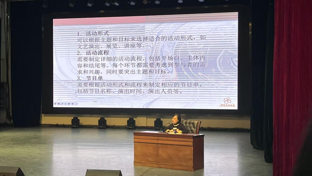 本次活动由音乐舞蹈学院院长刘利连教授主持。讲座伊始,曹团长首先介绍了群众文艺活动的重要性和当前的发展趋势。她强调,群众文艺活动是连接艺术与大众的桥梁,对于提升公众文化素养、促进社会和谐发展具有重要意义。随后,详细讲解了策划一场成功的群众文艺活动所需的各项步骤,包括明确活动目标、确定活动主题、制定活动方案、预算规划以及人员分工等。