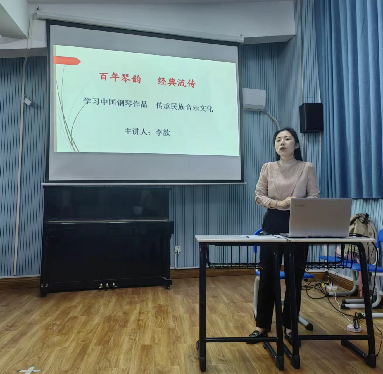 中国钢琴作品的创作已走过近百年的历程,为更好的开展中国钢琴作品演奏与教学,提高KY官网学生学术水平与专业素养,KY官网李歆博士于2023年10月23日晚7:30在逸夫楼605声乐实训室开展了一次关于学习中国钢琴作品,传承民族音乐文化的学术讲座。讲座由钢琴教研室田苗老师主持,来自音乐舞蹈学院钢琴教研室的老师们和全院钢琴专业的学生参加了讲座。