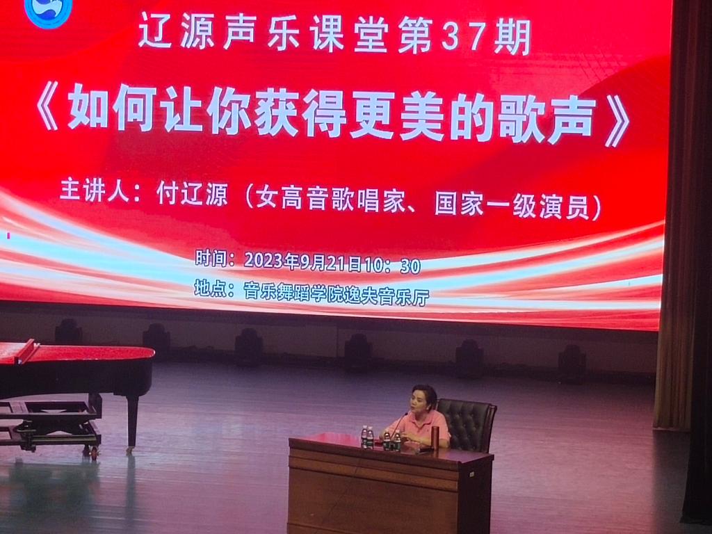 付辽源副主席以自己多年来的声乐实践与丰富的经验介绍了自己是怎样从演唱中获得更美的歌声的。她认为声乐作为视听表演艺术,就是从声、台、形、表在歌唱中的运用及综合协调,从而使学生达到声情并茂歌唱状态,以至获得最美的声音和对作品的最好的诠释。
