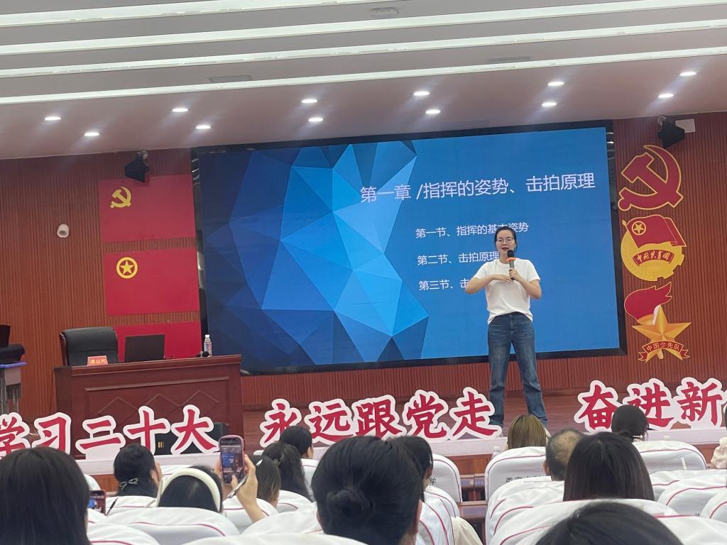 下午谭以珂老师以《合唱与指挥》为主题,为老师们分享了指挥法中常见的图示、拍点、预备拍、起拍、收拍等内容,通过对不同的风格的合唱作品进行分析,将枯燥的理论与实践完美结合,带领现场老师们从合唱歌曲的选择到案头工作的讲解,最后进行指挥设计,让老师们深刻感受到指挥法带来的艺术魅力。