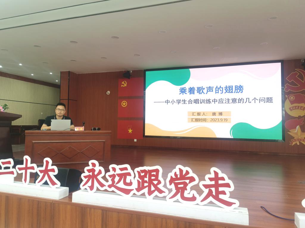 本次培训主要针对娄星区各中小学音乐老师,在合唱指挥排练过程中所遇到的现实问题,将先进的理论与实践经验带回自己的课堂中去。上午唐博副教授做了题为《乘着歌声的翅膀——中小学生合唱训练中应注意的几个问题》专题讲座。唐老师就童声合唱的声音特点与表现形式、中小学生的发声训练与嗓音保健、合唱作品的选择设计与艺术处理、合唱队形的巧妙编排与舞台表演等方面进行了深入浅出的讲解,并辅以案例、视频、图像,使在场的每一位老师深刻认识到中小学生合唱训练的科学方法与有效途径。