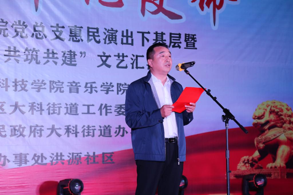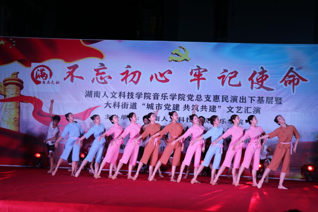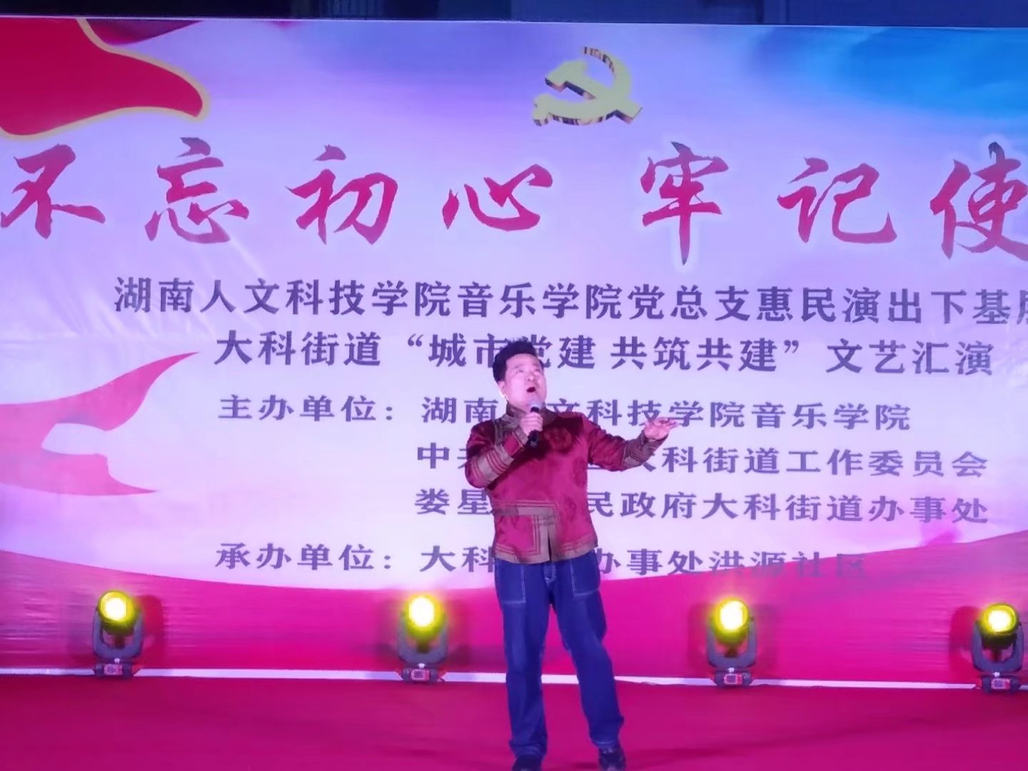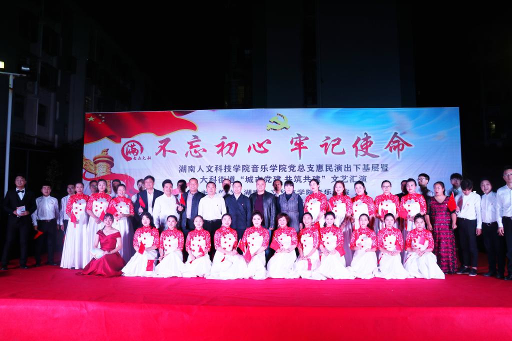 10月29日晚七点半,由中共KY开元集团官网入口音乐舞蹈学院党总支部举办的“不忘初心、牢记使命”文艺汇演在娄底市娄星区大科街道办事处洪源社区举行。KY开元集团官网入口组织部常务副部长罗求实、机关党委书记刘纲华、宣传统战部部长陈璐、音乐舞蹈学院党总支书记周邦春、副书记邓莉立、副院长吴扎拉·涛、副院长刘利连及洪源社区领导代表出席本次活动。音乐舞蹈学院全体师生党员及部分学生群众共同为洪源社区的父老乡亲们奉上了一台精彩的红色演出。