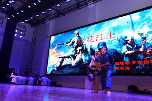 汇演由音乐舞蹈学院院长谢坚强作曲,周邦春副书记指挥的民族管弦乐合奏《花好月圆》、《潇湘乐》拉开了帷幕,音乐时而轻柔,绵长悠远,时而激昂,气势宏伟,在场的观众无一不为之感染。紧接着,群舞《军鞋》,使观众们深刻体会到抗战时期战士们的艰辛,为抗战胜利的坚定信念和无法忽略的博大母爱。