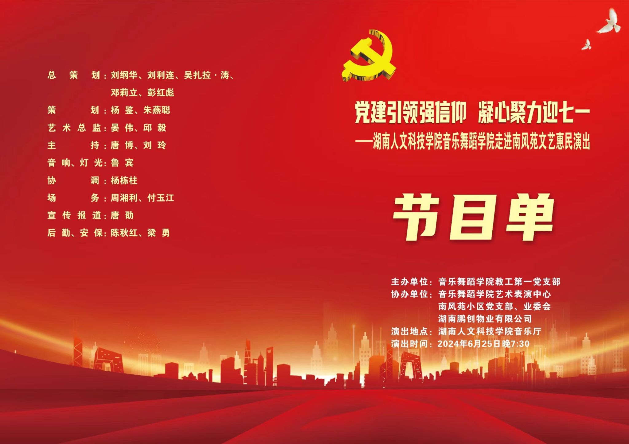 在中国共产党103岁华诞即将到来之际,KY开元集团官网入口音乐舞蹈学院教工第一党支部于2024年6月25日晚7:30在学校音乐厅开展“党建引领强信仰 凝心聚力迎七一”走进南风苑文艺惠民演出。音乐舞蹈学院师生党员以及南风苑业委会代表和500名观众参加了本次活动。