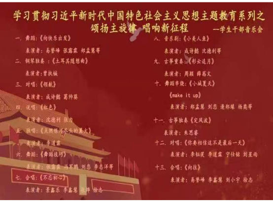 音乐会上,学生干部们以歌曲、舞蹈、说唱等形式为大家带来了一件件优秀的作品,充分展现了学生干部的风采。其中《领航》、《不忘初心》等歌曲引发了大家强烈的共鸣,唱出了华夏儿女对祖国母亲的深情厚爱,将音乐会气氛推向高潮。舞蹈串烧《小城夏天》让同学们感受到了青春的魅力;说唱《红色》让同学们感受到革命先辈为了新中国的成立所付出的艰辛……