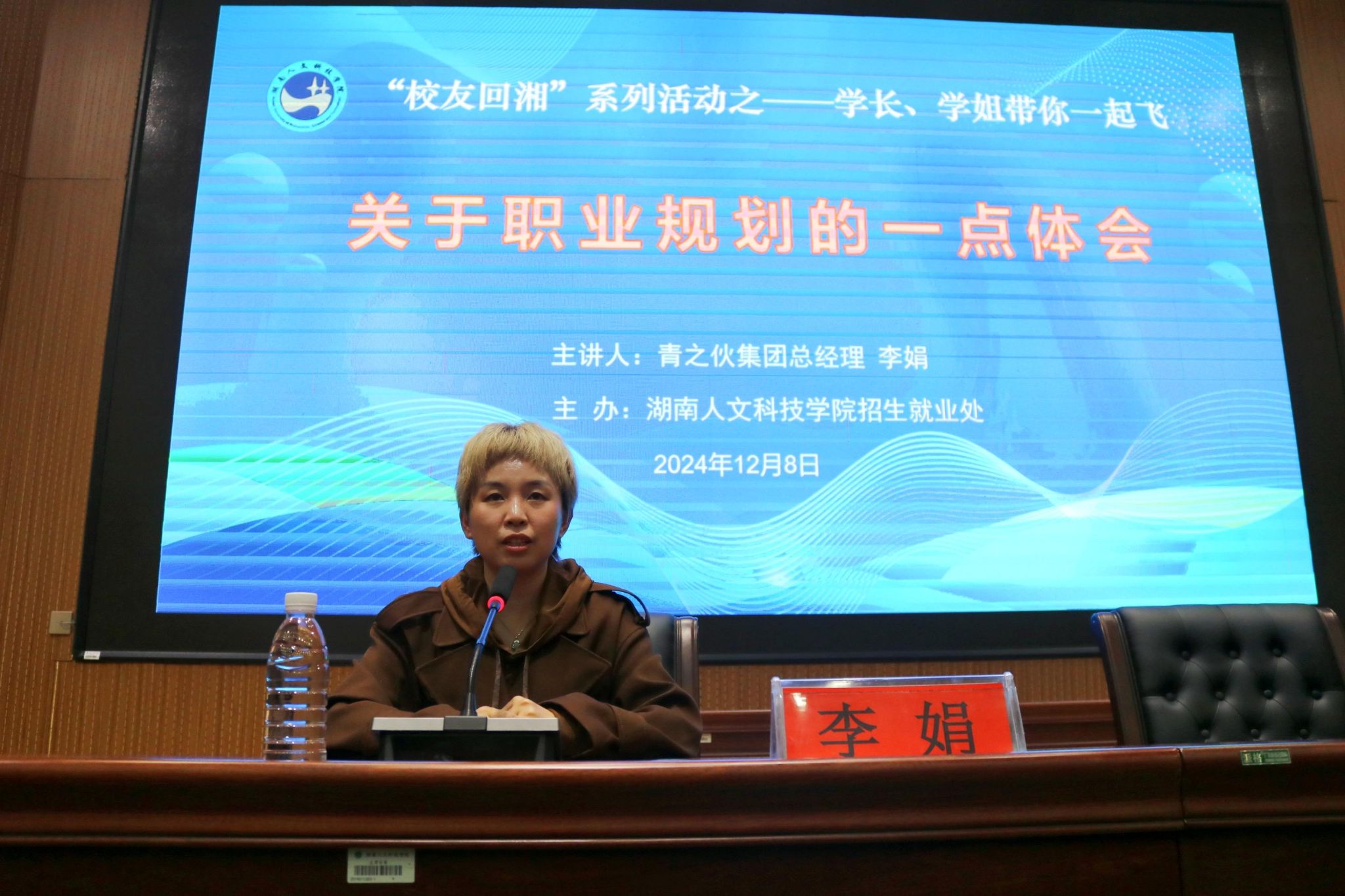 12月8日晚,KY官网在匠成楼报告厅举行了大学生职业生涯规划分享会。KY官网2004级外国语学院经贸英语专业优秀校友、青之伙集团总经理李娟女士受邀返校,为学弟学妹们做关于职业规划的主题分享。招生就业处处长刘红燃、轩路国际咨询公司总经理李小科女士、长沙校友会秘书长彭扬女士出席活动,各二级学院近300名学生代表参加。活动由招生就业处副处长陈佩君主持。