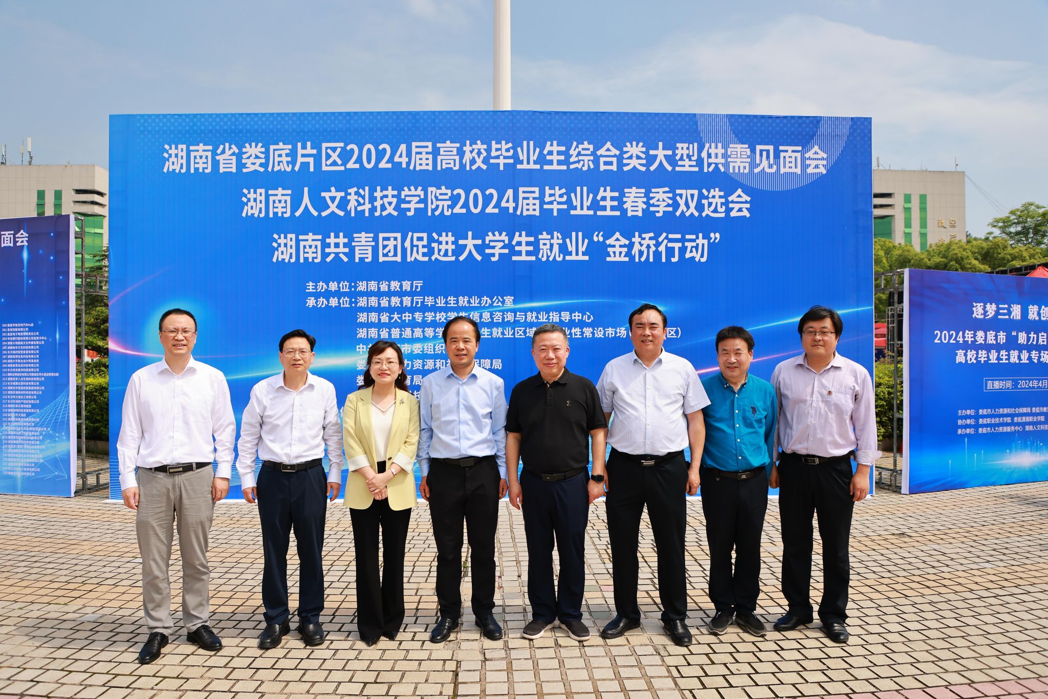 湖南省大中专学校学生信息咨询与就业指导中心四级调研员胡媛,娄底市人力资源与社会保障局党组书记、局长刘文波,学校党委副书记、校长盛明科,党委委员、副校长陈志国等领导现场指导工作,走访慰问用人单位代表,详细了解招聘情况,与毕业生亲切交流,勉励他们抢抓机遇、主动出击,尽早实现顺利就业。娄底市人力资源与社会保障局、市教育局相关负责人、学校招生就业处、二级学院负责人、就业专业参会,现场指导毕业生求职。
