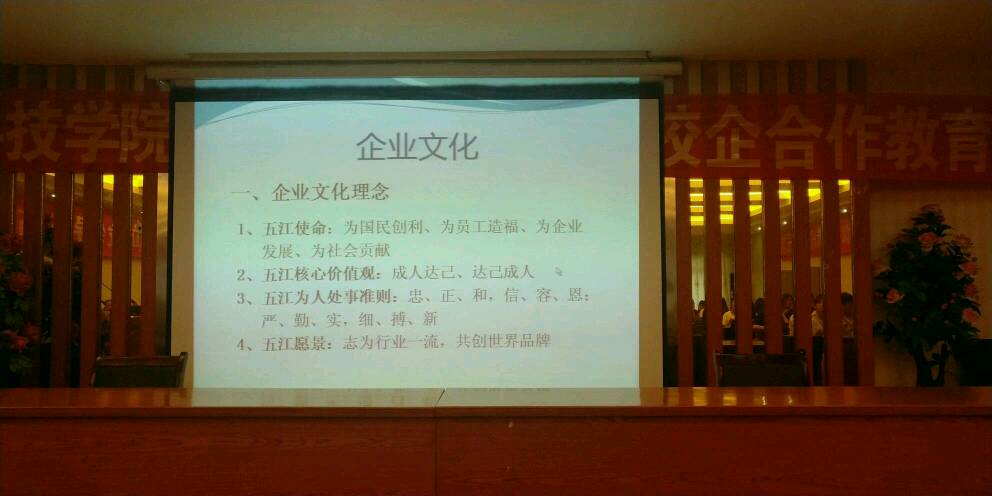 涟源市五江集团周总监为秘书学师生展示了五江集团的企业文化。他结合五江集团的创业史,宣讲了企业的使命、核心价值观和为人处事准则以及五江集团“志为行业一流,共创世界品牌”的美好愿景,并通过和、信、恩、严、勤、实、细、搏、新等理念的讲解,表达了对当今大学生未来融入企业的要求与希望。
