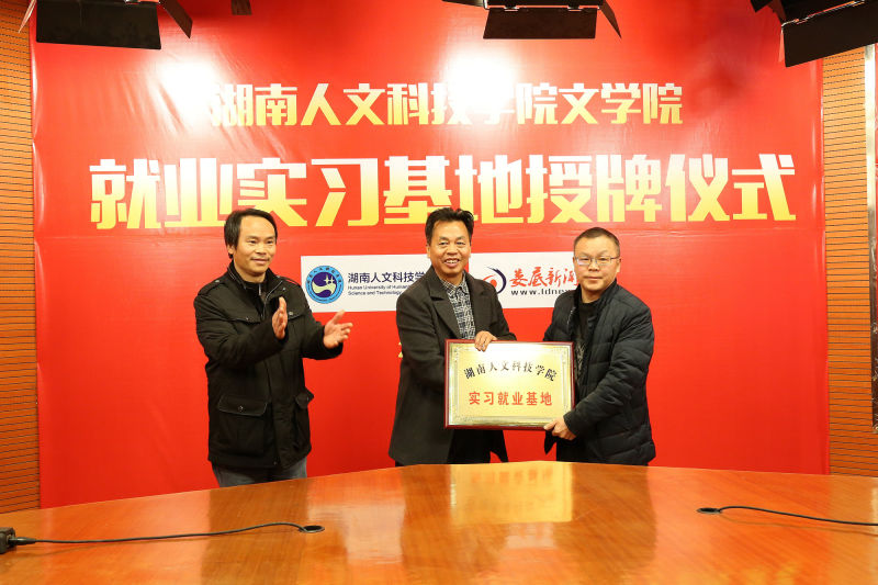 2017年11月12日,由文学院院长黄立平代表文学院与娄底红网成功签订大学生就业实习基地协议并授牌。文学院各老师、辅导员参加了签字仪式。