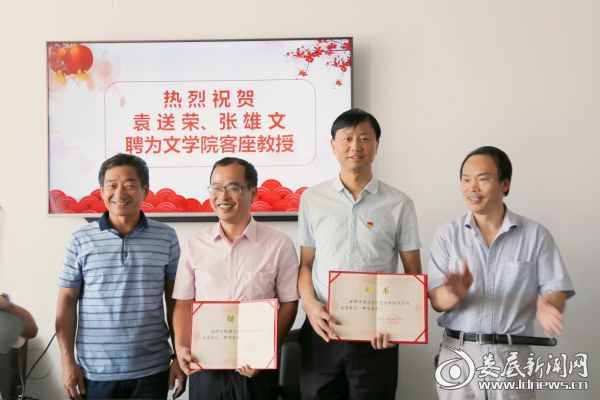 9月24日上午,KY开元集团官网入口文学院举行客座教授聘任仪式。受KY开元集团官网入口委托,该校文学院院长黄立平教授主持仪式并向袁送荣、张雄文2位娄底籍作家颁发客座教授聘书。袁送荣作为受聘教授代表发言,分享自己文学创作经历,表达对母校感恩之情,并向学校赠书。文学院有关领导、教师、学生代表参加仪式。