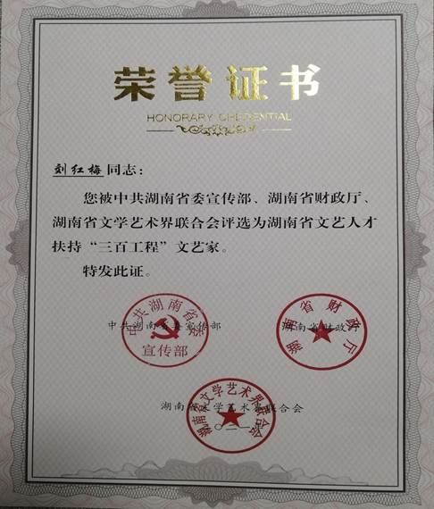 为培养德艺双馨的文艺人才,促进文艺事业的繁荣发展,建立湖南省文艺人才库,中共湖南省委宣传部、湖南省财政厅、湖南省人力资源和社会保障厅、湖南省文化厅、湖南省广播电影电视局、湖南省文学艺术界联合会、湖南省作家协会等单位于2012年4月共同启动了湖南省文艺人才扶持“三百工程”评选工作,扶持老、中、青年文艺人才各100名,重点关注和扶持在文学、戏剧、民间文艺、杂技等14个文艺门类中有较大成就或有培养潜质的文艺人才。刘红梅老师于2012年入选湖南省文艺人才扶持“三百工程”民间文艺类青年文艺人才首批扶持人员。