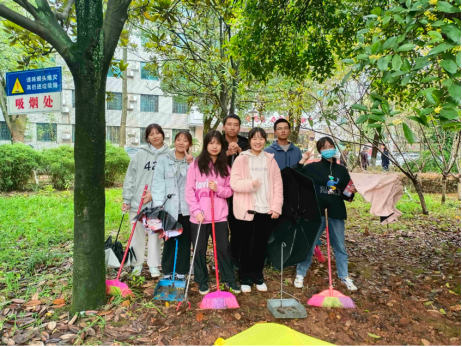 小雨纷纷落下,润湿了花田的泥土,厚厚的落叶平铺在泥土上,像一块春天编织的褐色地毯。在团支书杨芝其的带领下,同学们各自从致远楼挑选合适的打扫工具,开始了花田劳作。面对层层落叶,同学们表现出的是对劳动的热爱,泥土弄脏了裤角,雨水打湿了脸庞,同学们没有怨言,一直埋头苦干。花田里的小道上,同学们纷纷弯下腰捡起地面上的果皮纸屑,扔进垃圾箱中,小道重新变得干干净净。清明时节的春风带着丝丝凉意,吹拂着同学们的脸颊,为同学们带走了疲惫,留下了一段惬意的时光。