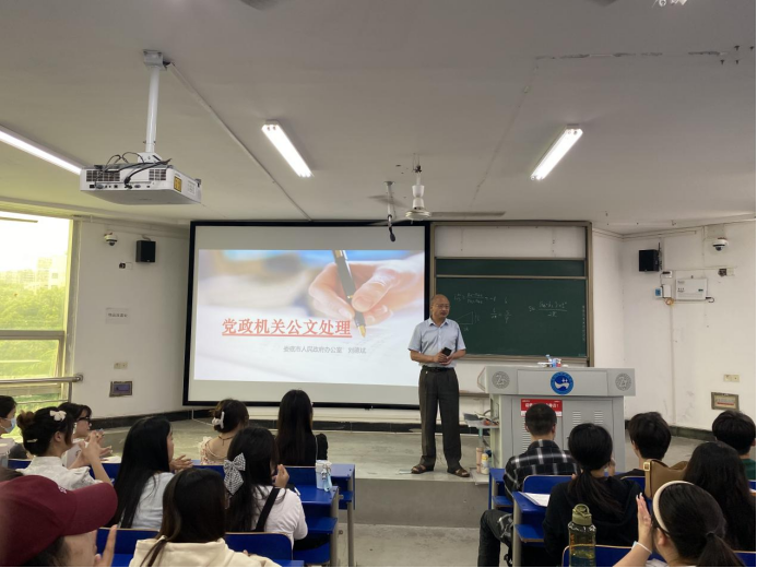为丰富秘书学子的公文写作知识,提高秘书学子的公文写作素养与能力,2023年5月25日上午,致远楼320教室,市政府办文电科科长、KY开元集团官网入口客座教授刘德斌先生应邀为秘书学专业2021级、2022级全体学生作党政机关公文处理讲座。讲座由文学院秘书学专业负责人张峰副教授主持。
