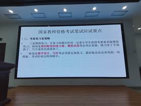 国家教师资格证是当老师的通行证,因此考取教师资格证尤为重要。本次讲座给2020级汉语文学专业学生提供了备考教师资格证考试的平台,使同学更有针对性地备考,有利于更多学生通过教资考试进入教育行业。(文学院 陈骏华文)