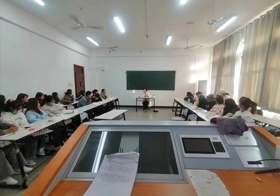 读书会开始,李洋为同学们介绍了曹禺先生及《雷雨》的主要内容。接下来,刘芊、高露珊、刘滢涓等11位同学为大家倾情表演了《雷雨》第四章。她们的精彩表演让作品中每个角色都“活”了起来,使同学们更好地看到了剧本中不同人物的鲜明性格特点。随后,现场同学就作品及表演积极分享自己的所悟所想。最后,纪忠璇老师对本期读书会进行了细致的总结和点评。她指出:《雷雨》中除了阶级矛盾外,还有宿命论、神秘感和人性的立体的思考,“人性就是这样,一定要多方面的立体的去探讨”。如“鲁侍萍”本姓“梅”,寓意其像寒冬里的一朵梅花;但“侍萍”却是要她像浮萍一样无依无靠,作品以此呈现深深的宿命论观念。纪老师的总结生动有趣,浅显易懂。通过她的总结,《雷雨》中暗含的玄机清晰地呈现在同学们面前。读书会结束后,主持人李洋代表全班同学把同学们精心准备的书签礼物赠送给了纪老师,以表达同学们深深的感激之情。
