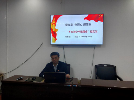 1022下午学校纪委书记杨鑫铨在致远楼213以“党章、守初心,担使命”为主题,为文学院全体师生党员讲述了一堂生动深刻的主题党课。。