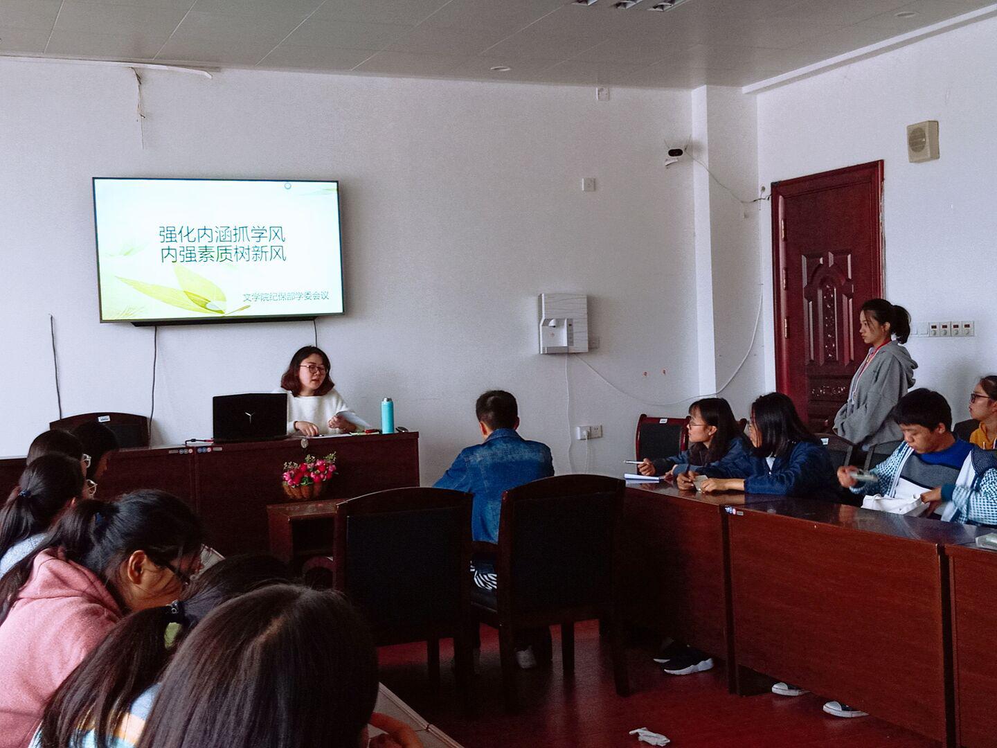 2018年10月16日15:00,于致远楼213会议室召开文学院全体学习委员会议,会议主题是“强化内涵抓学风 内强素质树新风”,会议由左玉洁老师主持,会议上左老师与同学们强调了:学风是学生思想道德品质、学习精神与综合素质的重要体现,是学生成长的基础和前提。学风的建设是高校校风建设的重要内容。优良的学风是提高教学质量、建立良好校风的重要条件。一直以来,学校坚持把学风建设作为提高教学质量和育人水平的重要工作来抓,把学风建设作为服务学校人才培养的切入点和着力点来认真抓好抓实。为加强学风建设工作,文学院重点开展了以下工作: 一、以制度建设为保障,强化学风建设各项措施的有效实施。二、以教风建设为基础,促进良好学风的养成。三、以主题教育活动为载体,培育优良学风的形成。四、以加强管理为抓手,营造良好学习氛围。五、以激励示范为导向,引领学生成长成才。六、以宣传教育为手段,营造浓厚学习氛围。