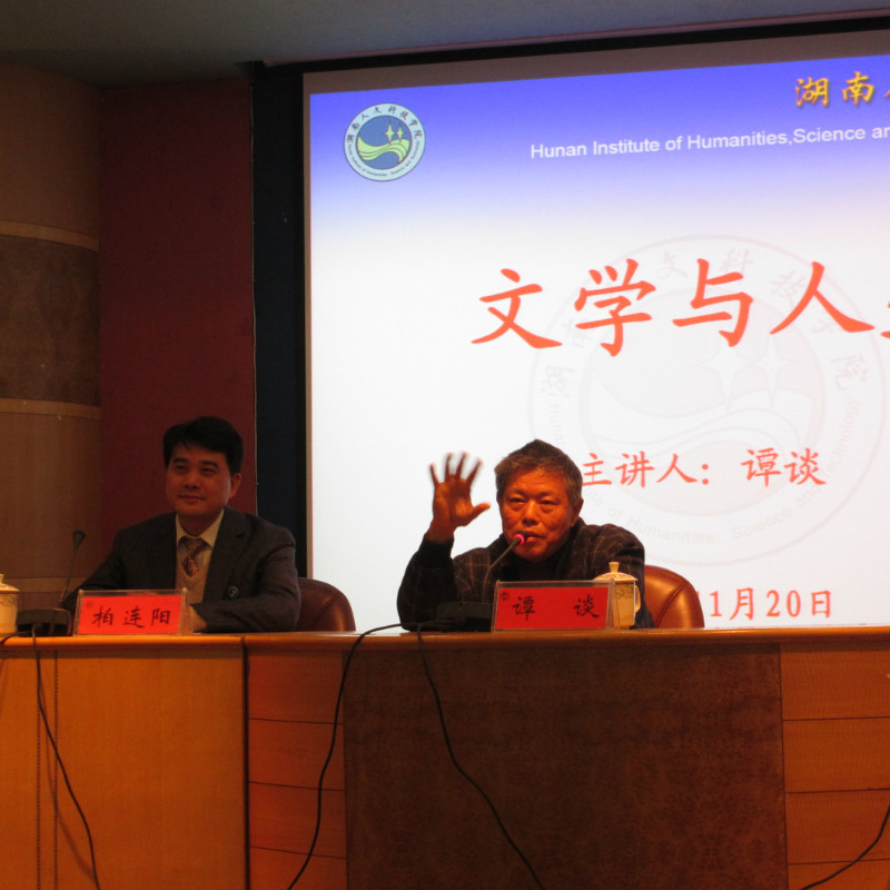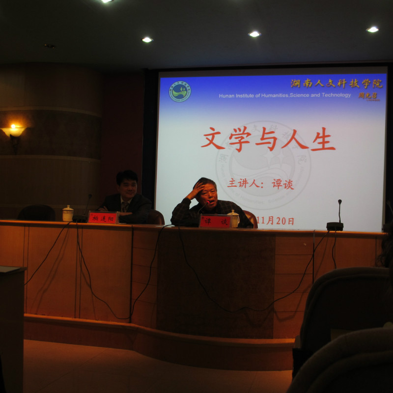 在讲座中,谭老师首先讲述了文学与人生的关系——“文学滋润人生,人生烘托文学”,全面地诠释了文学与人生的真谛。另外,谭老师又结合了自己在家乡涟源少年时的经历和故事以及自己参军之后的文学创作历程,谭老师优雅风趣的讲话使得在场的人深受鼓舞、启发。最重要是讲到了自己文学的创作之路时,说出了自己在年轻时饱受过的饥馑之苦。这为它后来文学创作打下了基础。他说这也证明了“苦难就是财富”。这也让嘉宾们深深体会到了人生必须要有所经历才会有领悟。