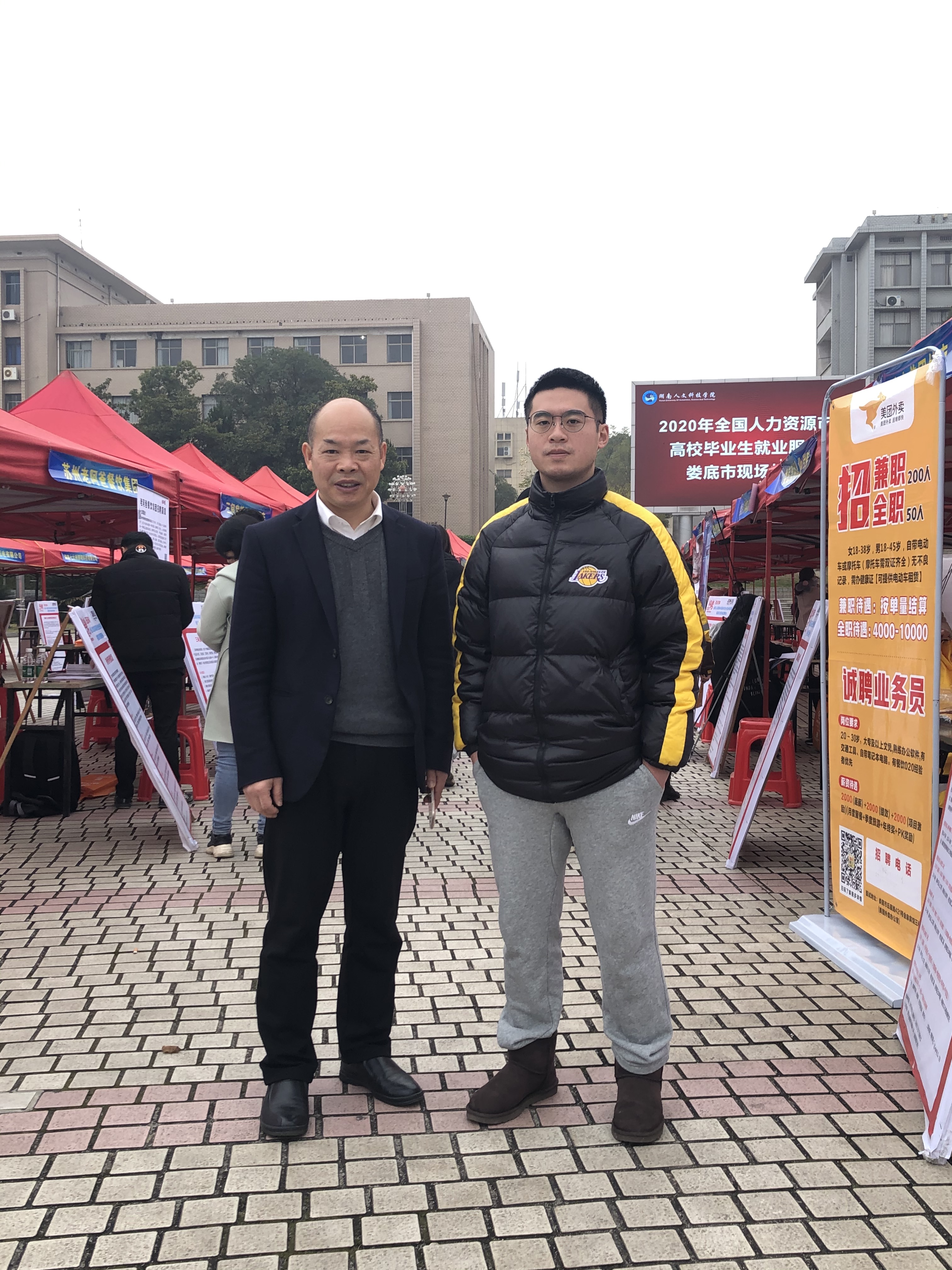 文学院党总支副书记刘道锋及辅导员唐久乐在招聘会现场