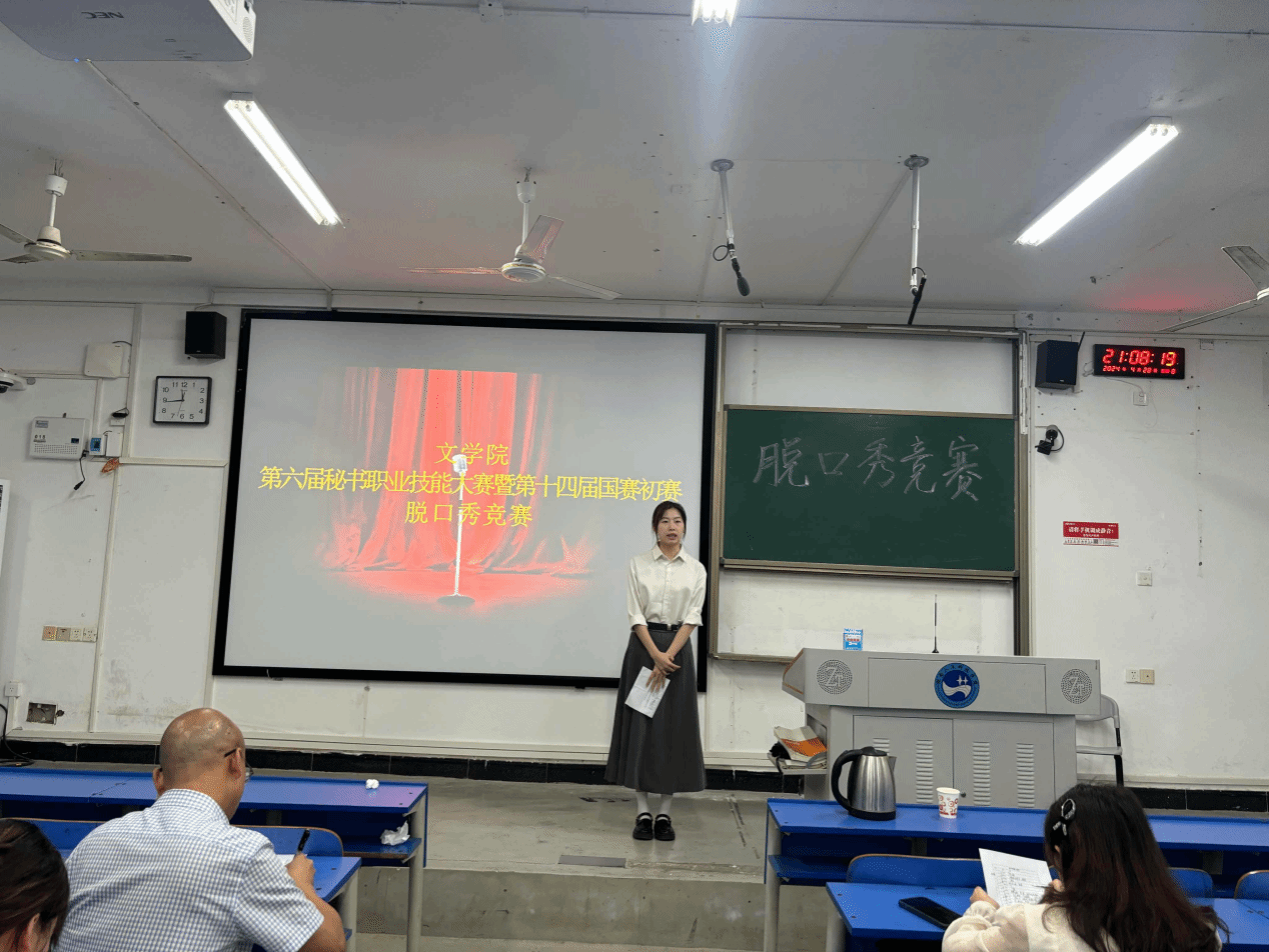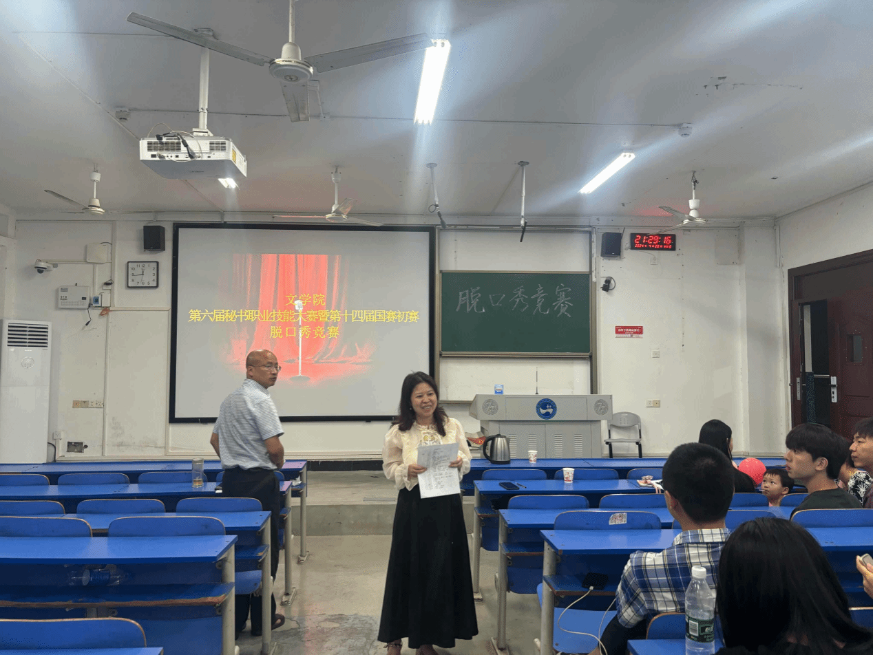 2024年4月28日晚19:30,文学院在致远楼211教室举办第六届秘书职业技能大赛之脱口秀竞赛。本项竞赛由文学院秘书学专业负责人张峰、演讲与口才课专任教师李亚珍、陈茜茜老师担任评委。共有32位秘书学子参与竞赛。
