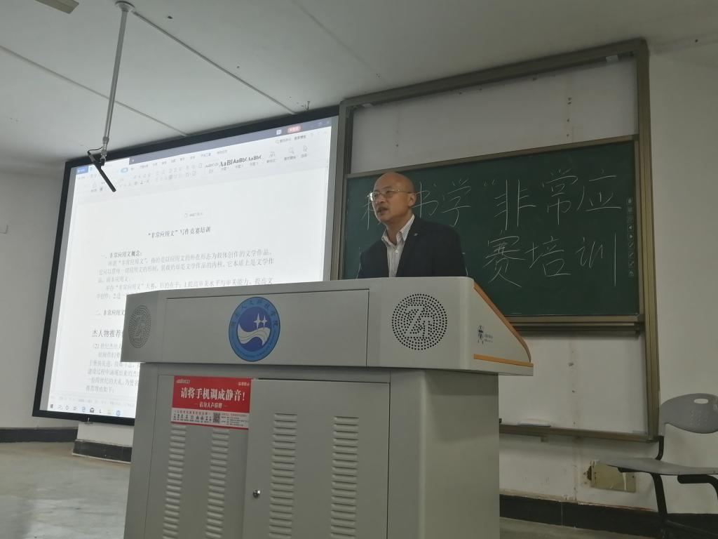 赛前培训由文学院教师张峰主讲。张峰老师首先向在座同学们介绍了"非常应用文”这一体裁。“非常应用文”尽管是应用文的形制,却装载了文学内核,与一般意义上的应用文有明显区别。接着,张峰老师对《推荐一门致富新技术:口技》、《对行贿者的公开信》等五篇非常应用文进行解读,启发在座同学们的写作思路。