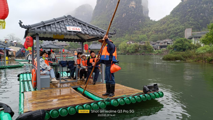 29日,师生浩浩荡荡奔赴阳朔。山做青罗带,水如碧玉簪。桂林的山,孤绝突兀,势不两立;阳朔的山,连绵起伏,层峦叠翠。上午,采风队伍抵达月亮之山。月亮山移步换景,朔望循环,令人叹为观止。紧接着,师生去遇龙河乘竹筏。遇龙河碧水长流,竹影婆娑,两岸青山,倒映水中,美不胜收。天公作美,正值阳朔雨后,山水间云雾缭绕,恍若仙境。遇龙河里,学生们尽兴玩水,陶醉在大自然的怀抱里,个个成了浑身透湿任性“诗人”。